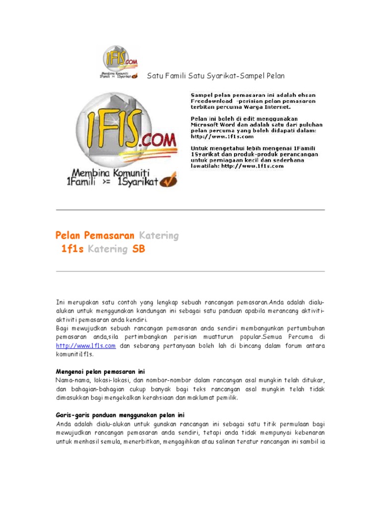 Contoh rencana pemasaran pada threat ini mencakup munculnya pesaing baru risiko yang harus dihadapi atau semua hal yang menimbulkan potensi bahaya bagi usaha yang sedang dijalani. PELAN PEMASARAN Strategi pemasaran SNEK RIA FOOD INDUSTRIES adalah mengkaji dan peka terhadap segala keperluan pemborong-pemborong di sekitar Lembah Kelang. Pengurus Kewangan dan Pemasaran Nama penuh.